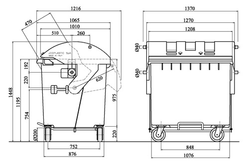Couvercle basculant à ouverture manuelle équipé à l’avant de deux vérins de levage obtenus lors de la phase de moulage et d’un joint en caoutchouc appliqué sur le bord avant.